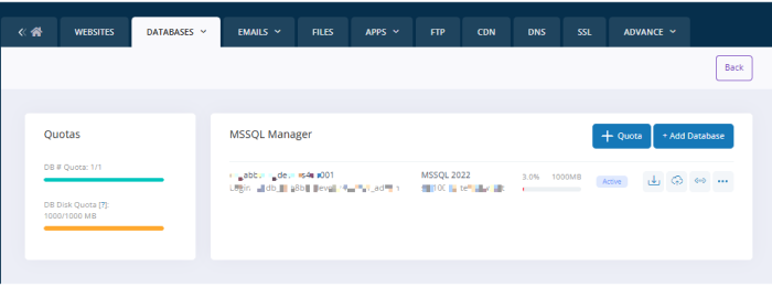 Navigate to the Database Manager and choose Microsoft SQL Server. Create a new database and define a database name, username, and password. Save these credentials for later use.